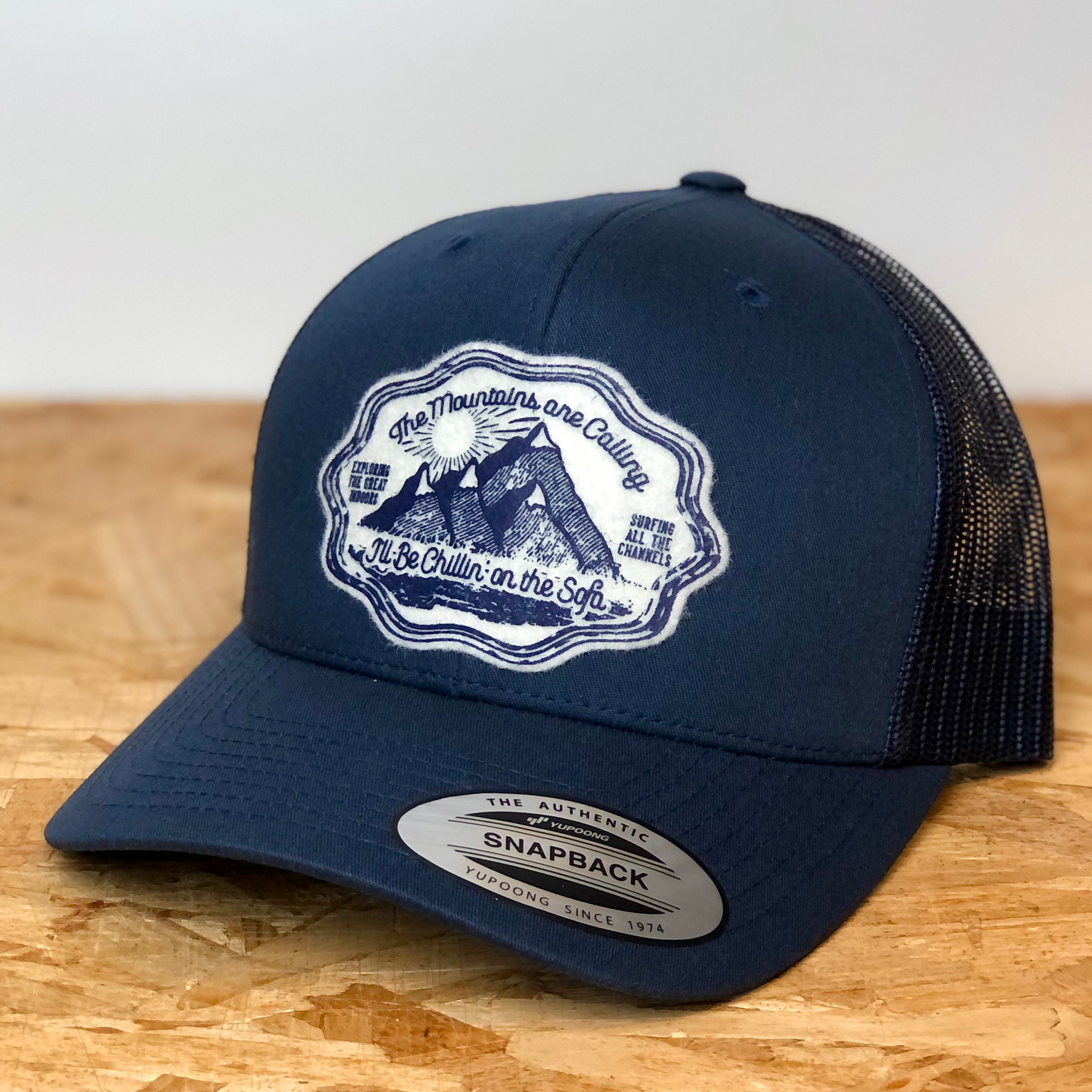 Genuine FlexFit Yupoong snapback Caps with our original designs hand-printed on 100% wool felt patches.